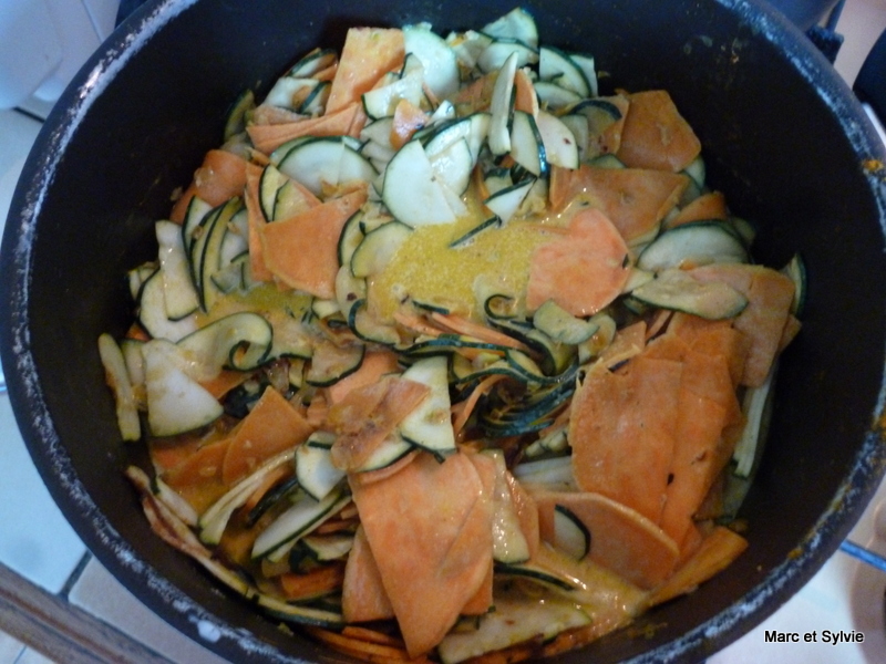Pelez, lavez et détaillez la patate douce ainsi que les courgettes en lamelles fines.