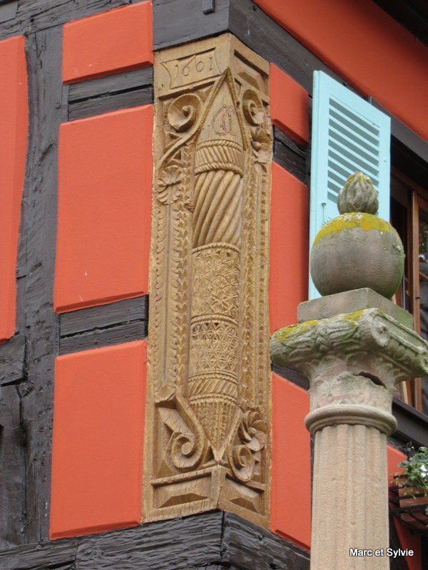 Sur la porte d'entrée se trouve l'emblème du boulanger. À l'étage, un poteau cornier est, lui aussi, sculpté d'un emblème de boulanger.