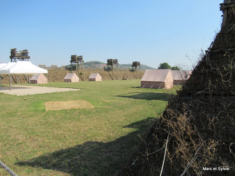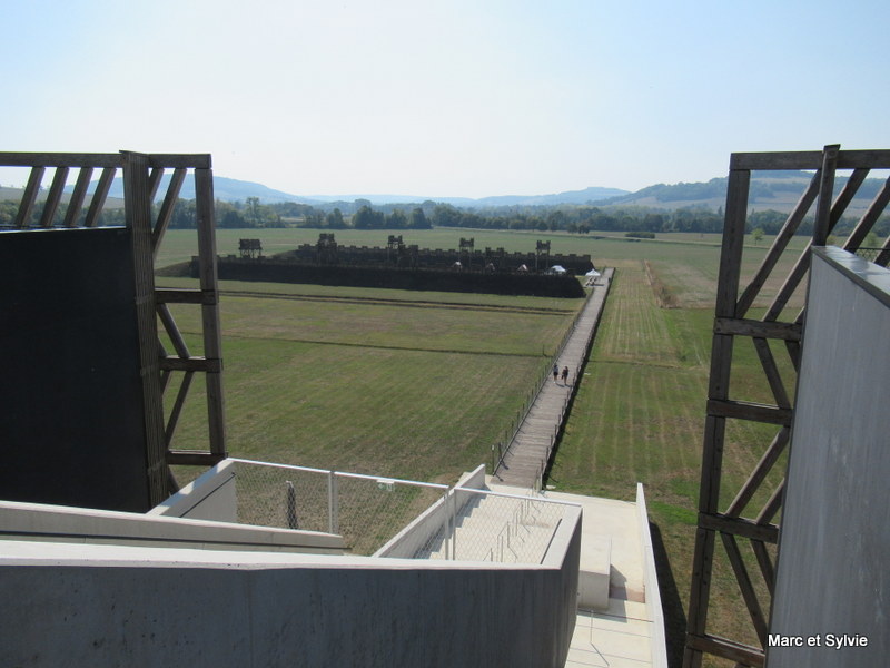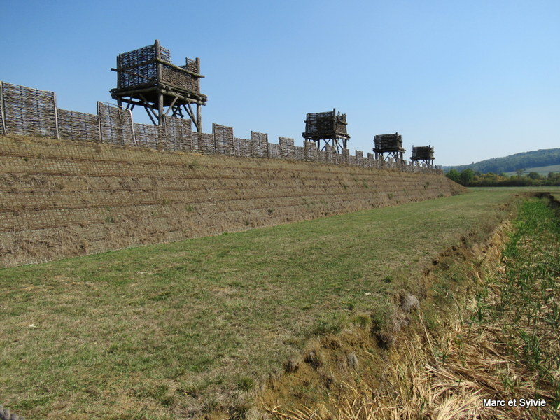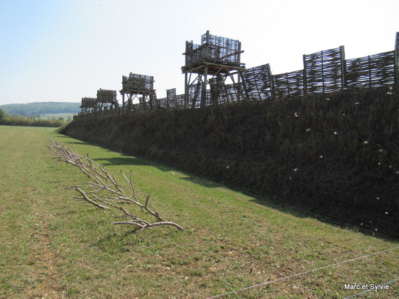 (6 clichés) Sur le site extérieur contigu, aménagé par le paysagiste Michel Desvigne, ont été reconstitués sur une centaine de mètres les doubles fortifications romaines. Tours de guet et de défense, fossés, remblai, rempart, armes de siège (catapulte et scorpio).....