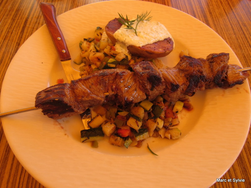 La suite du repas est tout aussi gourmand.....Voyez cette assiette ! Une brochette de boeuf charolais.