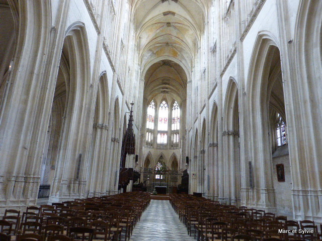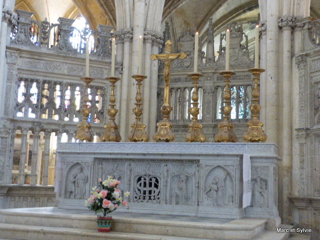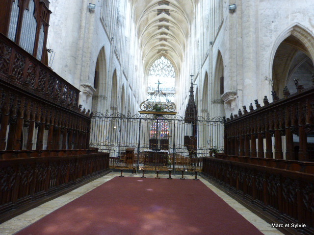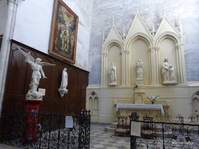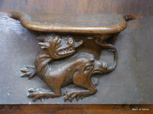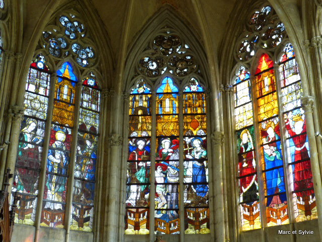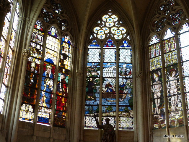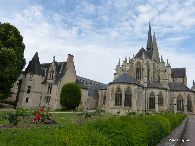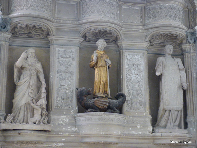 | Vendôme, cité construite au creux d'un méandre du Loir, a une riche histoire médiévale et possède de nombreux monuments historiques.  Aujourd'hui, visitons l'abbaye de la Trinité ! Vous pouvez-voir ou revoir notre balade à Vendôme depuis le début en cliquant sur ce lien! (14 clichés) L'abbaye de la Trinité de Vendôme est fondée en 1033 par Geoffroy 1er Martel, comte de Vendôme. La légende raconte que le comte de Vendôme vit trois étoiles tomber dans un puits, y voyant là un signe divin, Geoffroy Martel décida d'ériger à cet emplacement une abbatiale. L'abbaye bénédictine de la Trinité possédait une église dès l'époque romane mais en 1271, cet édifice va être démoli et reconstruit dans l’esthétique gothique. Un nouveau chœur est édifié vers 1308. L'harmonie des proportions et les larges baies ornées de motifs en trèfles sont représentatives de l'architecture gothique rayonnante. La colombe de Goudji ! Suspendue au-dessus de l'autel, la colombe est la représentation traditionnelle de l'Esprit Saint. Témoignage de foi, cette oeuvre d'art,  réalisée en argent et en lapis-lazuli, est due au prodigieux artiste, orphèvre contemporain, Goudji. Chapelle de tous les saints ! Chapelle saint-Pierre ! Chapelle des saints Vendômois ! Saint Bienheuré ! Saint Arnould Notre-Dame de Vendôme et.... Le dragon Chapelle Sainte-Marie-Madeleine ! Le choeur du 14e siècle est garni de belles stalles de la fin du 15e siècle. Les miséricordes s'agrémentent de scènes naïves racontant la vie de tous les jours..... .....à travers les métiers et les signes du zodiaque. Des petits modillons apparaîssent en haut des châpiteaux....un couple célèbre peut-être ? À bientôt !