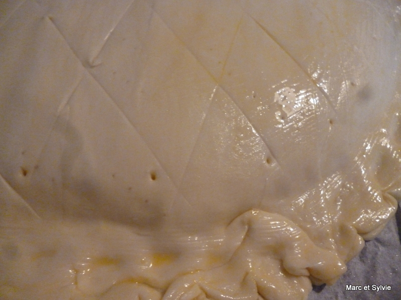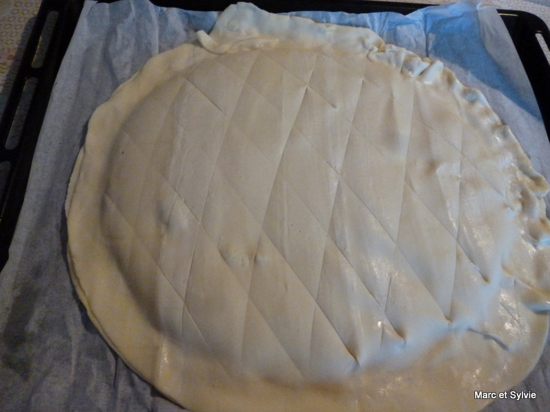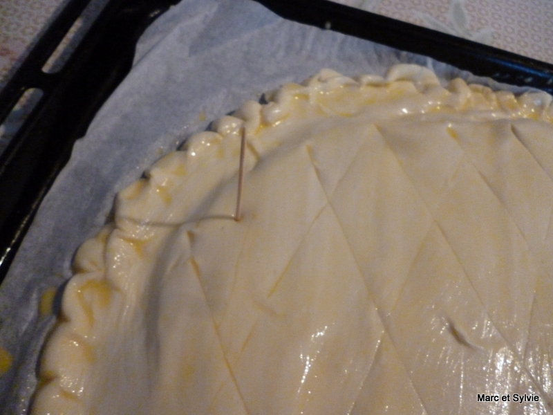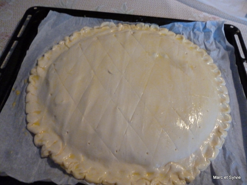 Cela soudera mieux les deux pâtes feuillitées. 4-Dorer le dessus de la galette avec un jaune d'ouef mélangé avec un peu de lait.