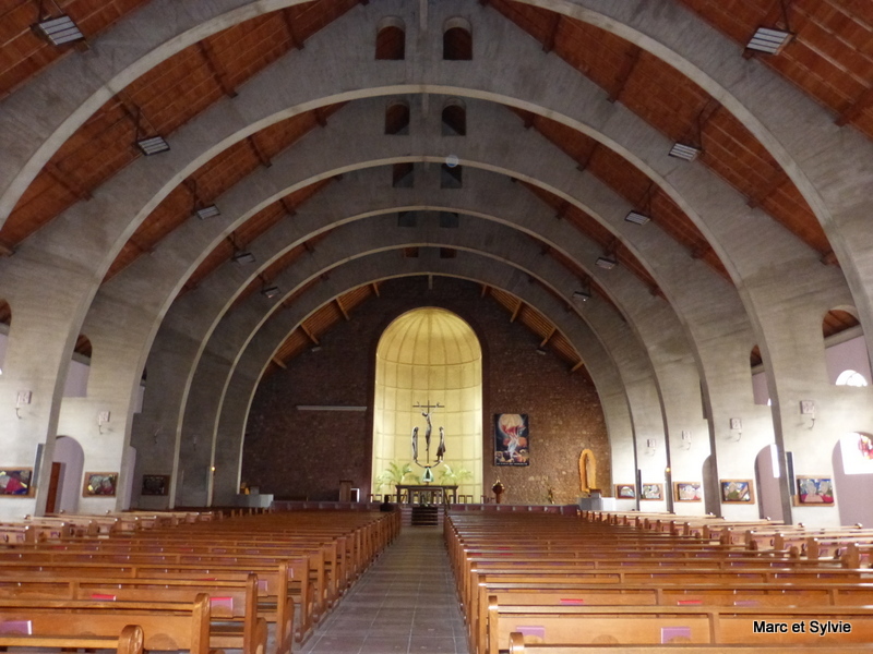 Les neuf arcs en béton qui soutiennent la charpente lambrissée de l'église lui confère un aspect assez moderne.