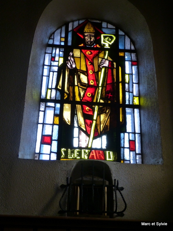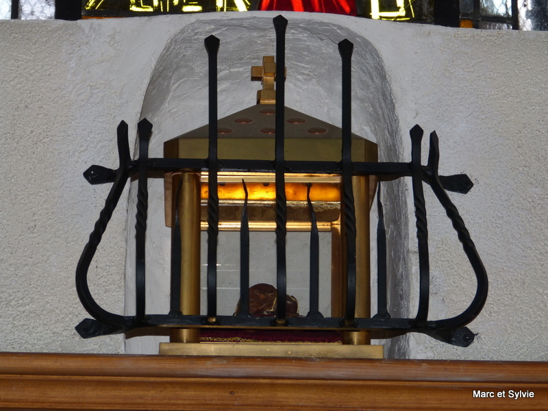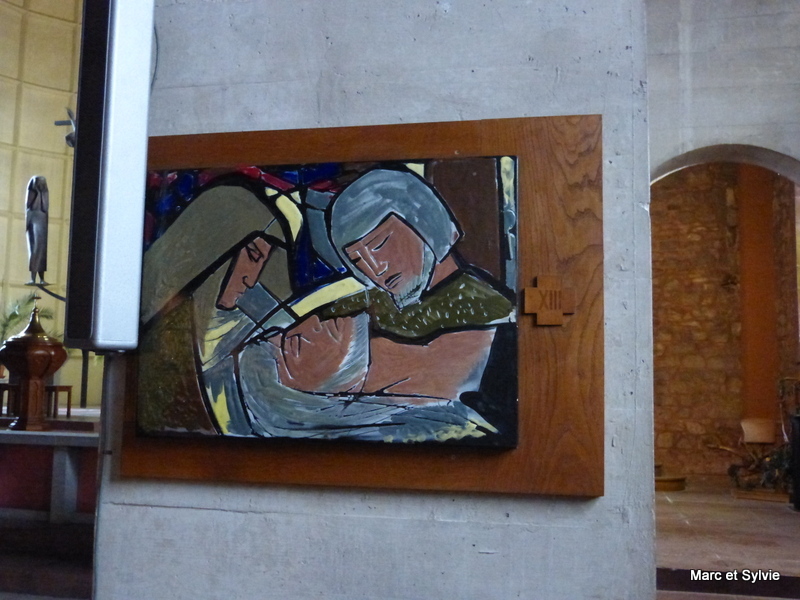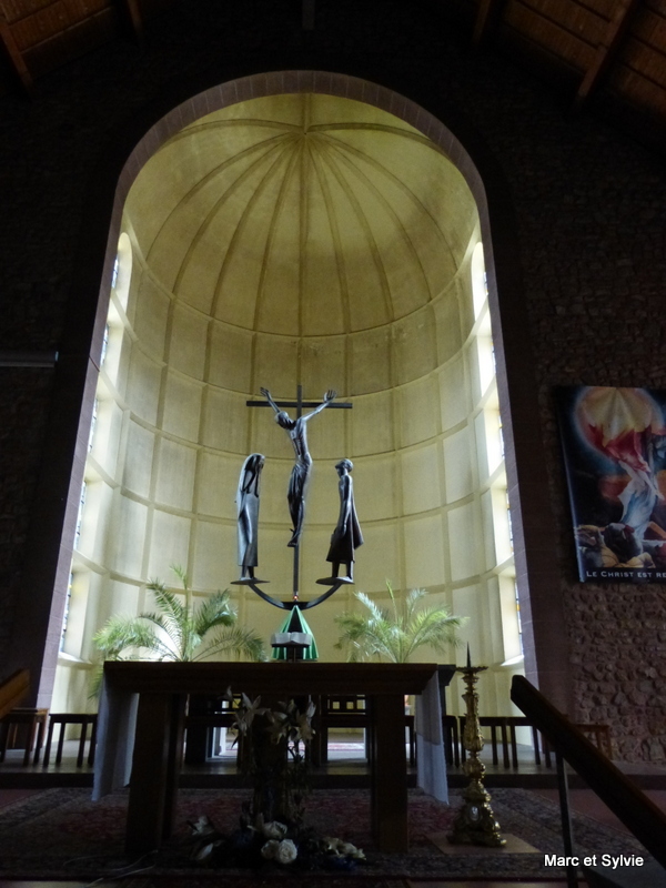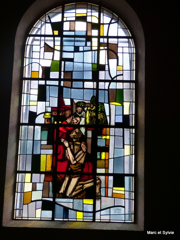 Une lumière naturelle pénètre par une série de vitraux percés dans les parois extérieures, conçus par François Chapuis et exécutés par les ateliers Ripault de Versailles.