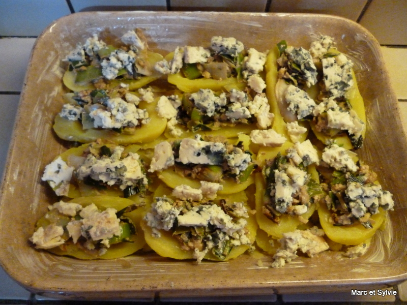 Garnissez-les de la farce aux poireaux puis recouvrez-les de lamelles de bleu.