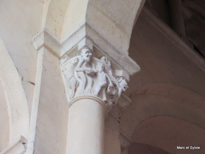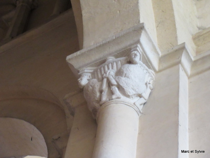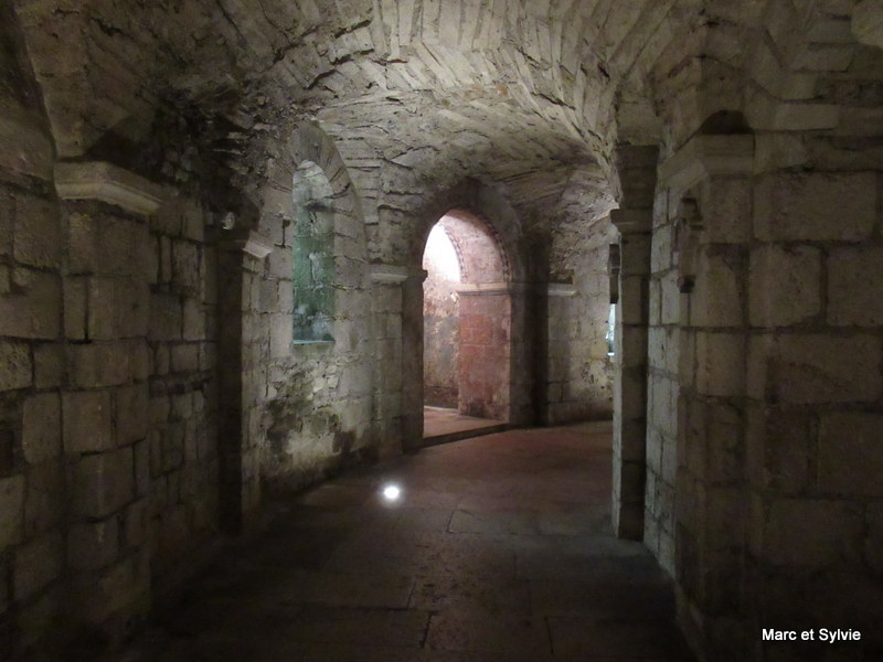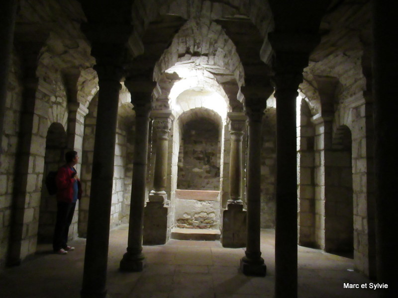 | L'accès à la crypte se faisait primitivement par deux escaliers permettant un parcours processionnel à sens unique.  Celui du sud ayant été muré, on n'accède plus actuellement que par celui s'enfonçant dans le sol du bras nord du transept.  Cette crypte est composée de plusieurs espaces contigus et structurés pour la circulation liturgique : c'est une des plus anciennes de ce genre. Vous pouvez voir ou revoir notre balade à Tournus depuis le début sur ce lien ! Au milieu de la crypte se trouve une salle centrale à trois nefs voûtées de même hauteur, portées par deux files de cinq colonnes et les murs de pourtour. Ce voûtement supporte le chœur de l'église. Cette salle est largement ouverte sur un déambulatoire, qui la circonscrit, par cinq portes et deux petites baies. Au total il y a donc, au niveau de la crypte, sept chapelles, toutes accessibles par le déambulatoire inférieur. À bientôt pour la suite de cette visite !