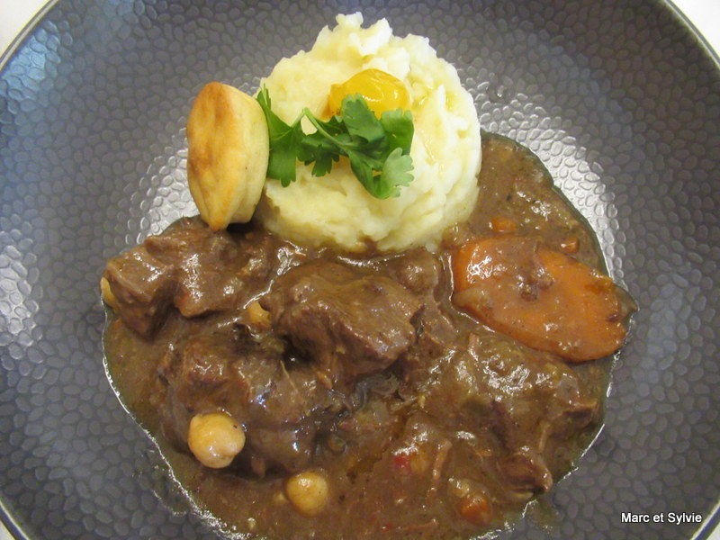 Pour la suite du repas Nicolas et Marc se régalent avec du paleron de boeuf braisé au vin rouge accompagné d'un écrasé de pommes de terre à la fève tonka.
