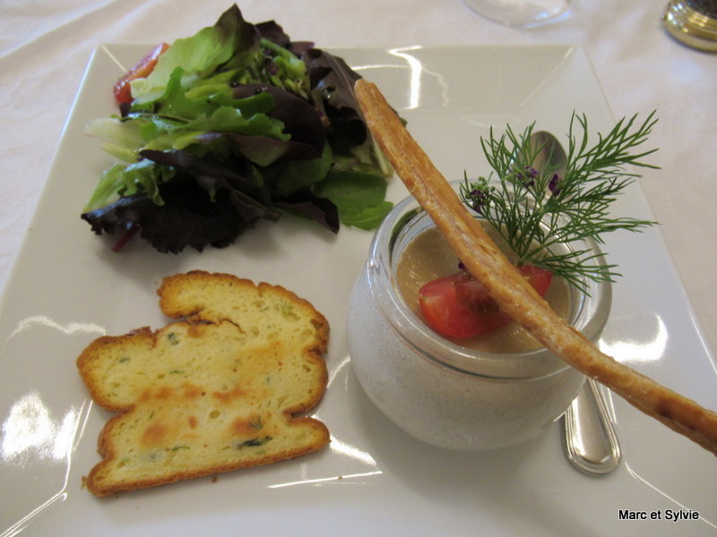 En entrée, je choisis un bavarois de champignons frais et sa gelée de légumes à la reine des près.