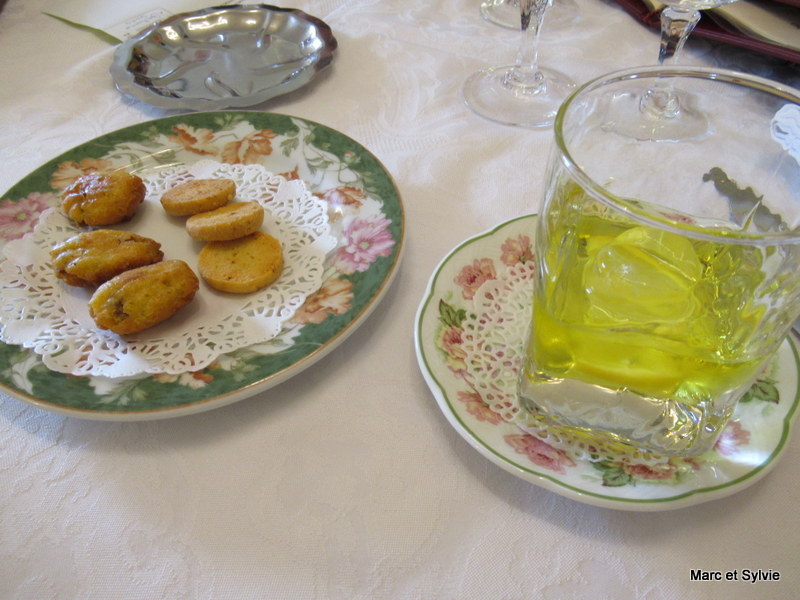 Pour débuter, je goûte un apéritif sans alcool, une gentiane artisanale. Un vrai délice. Cet apéritif est accompagné d'amuse-bouches bien gourmands, des sablés au parmesan et des madeleines olive et chorizo.
