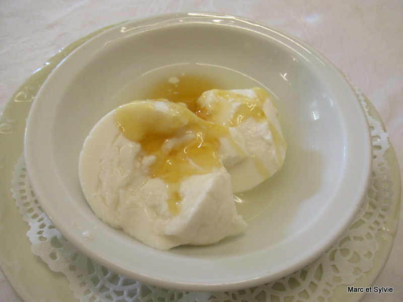 Mon dessert est absolument divin, de la faisselle de fromage au lait de chèvre « des biquettes de Sembadel » au miel de sapin de chez Coudert. Délicieux !