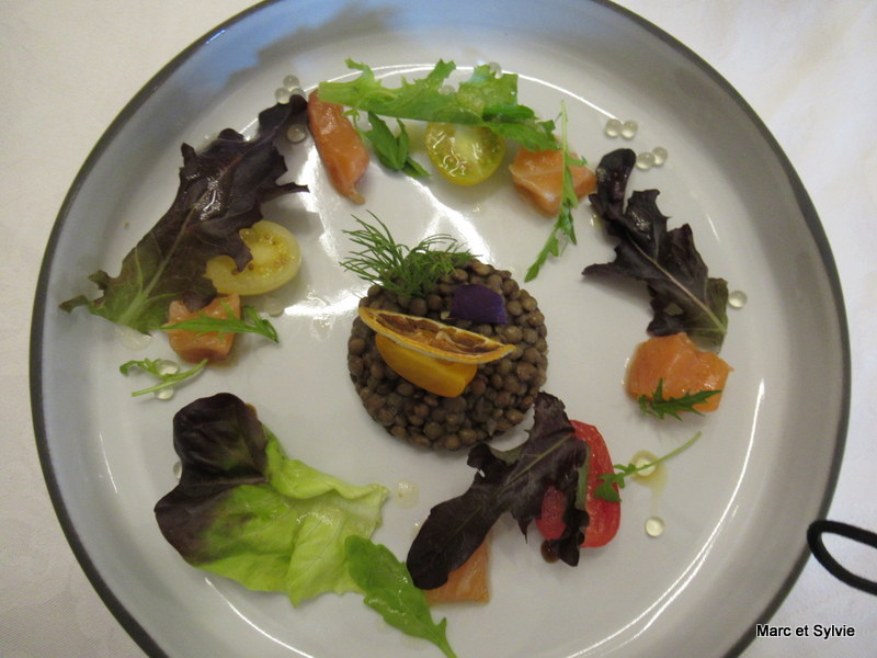 Marc et Nicolas se régalent d'une salade de lentilles vertes du Puy, gravad-lax de saumon et vinaigrette d'agrumes de yuzu.