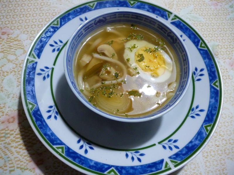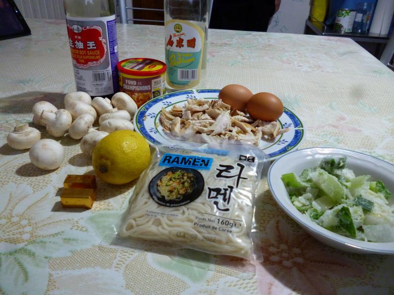 (4 personnes - préparation 10 minutes - cuisson 25 minutes) -200g de restes de volaille rôtie -1,5l de bouillon de volaille -200g de nouilles ramen -2 oeufs -1/2 poireau -quelques champignons de paris frais -1 càc de fond de champignons -2 càs de nuoc-mam -1 càs de sauce soja -1 citron -ciboulette Faites cuire les oeufs 10 minutes à l'eau bouillante.