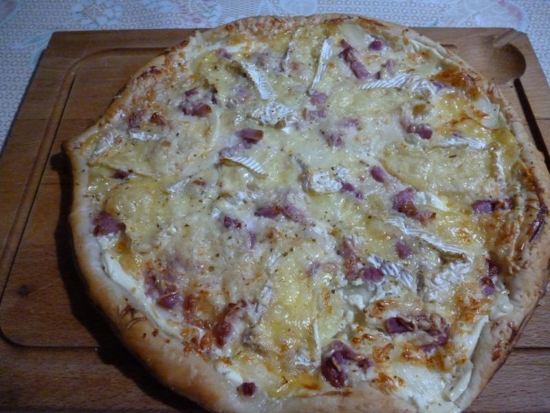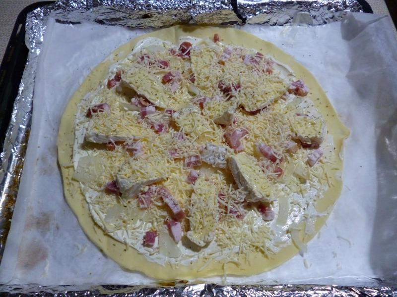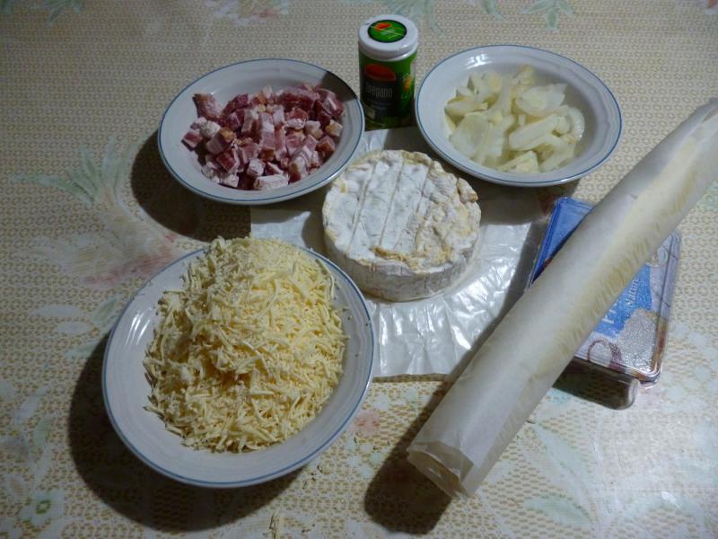 -1 pâte à pizza ou feuilletée -1 fromage frais de type schwarzwalder ou St Môret -100g de lardons -1 oignon pelé et haché -1 camembert -100g de gruyère râpé -origan Étalez la pâte feuilletée sur la plaque du four.