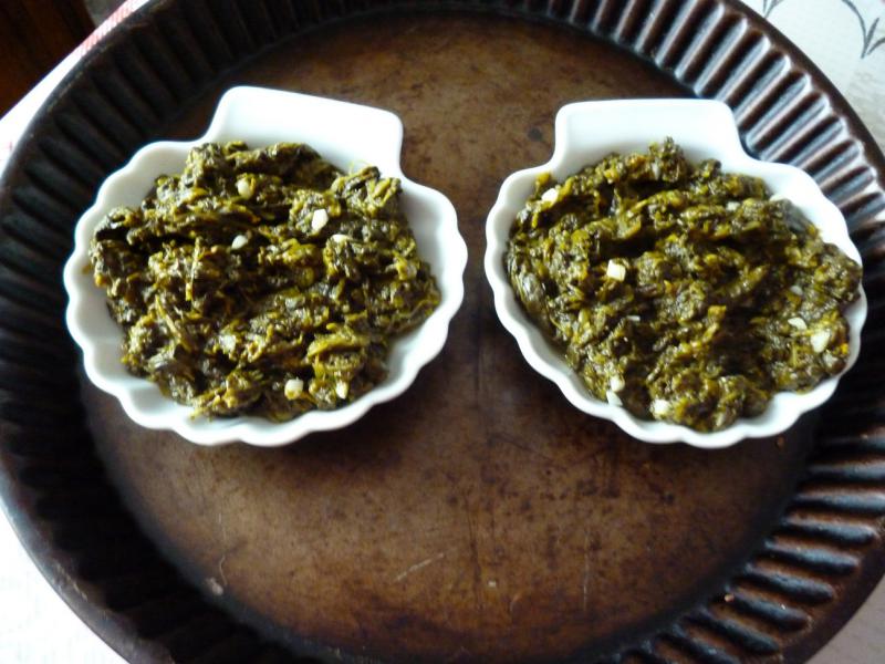 Égouttez les épinards, saupoudrez-les de 4 épices et répartissez-les dans les deux ramequins.