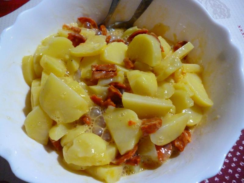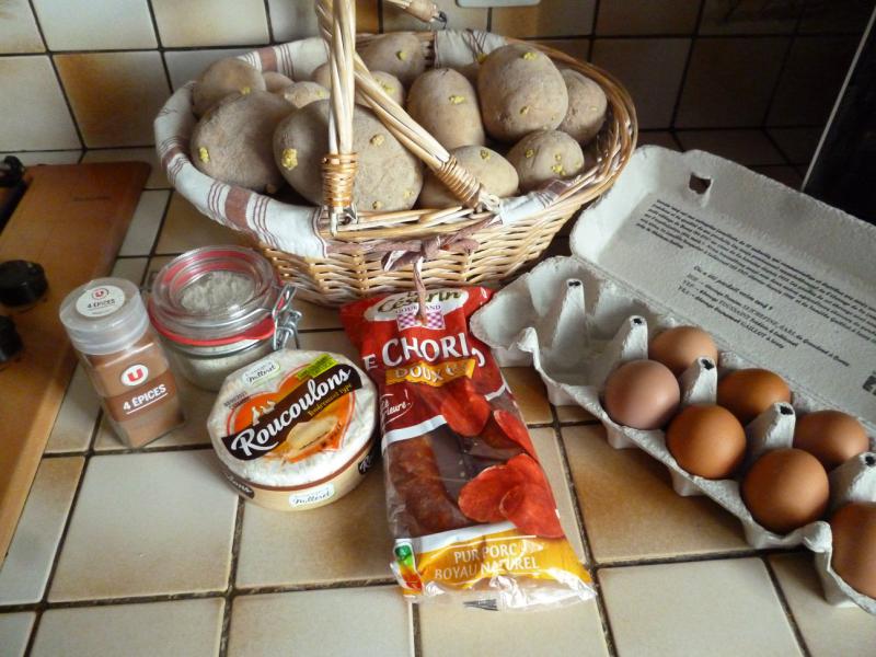 | La tortilla de patatas est une variante d'omelette, épaisse et garnie de pommes de terre.  Ce plat, typiquement espagnol, est souvent dégustée sous forme de tapas dans les bars d'Espagne. Aujourd'hui, je cuisine une tortilla au Roucoulons ! Les ingrédients pour cette recette: (4 personnes - préparation 20 minutes - cuisson 30 minutes) -1 fromage Roucoulons -1kg de pommes de terre -100g de chorizo -8 oeufs -sel, 4 épices Faites cuire les pommes de terre en robe des champs. Pelez le chorizo et coupez-le en rondelles. Battez les oeufs en omelette. Pelez-les et coupez-les en rondelles. Dans un saladier mélangez les pommes de terre, les oeufs et le chorizo. Salez et saupoudrez de 4 épices. Beurrez un plat à gratin et versez-y la préparation. Coupez le Roucoulons en tranches et répartissez-le sur les pommes de terre. Glissez le plat dans un four à 210° pendant 30 minutes. Bon appétit ! Vous pouvez retrouver d'autres idées "oeufs" sur ce lien.