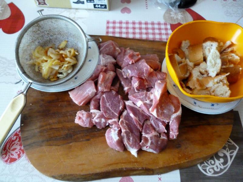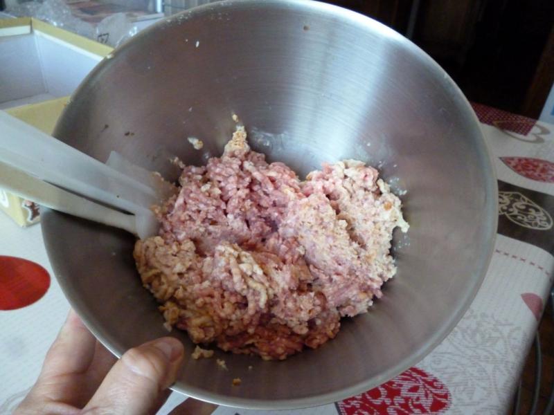 Passez tous les ingrédients....viande, pain et oignons....dans le hachoir en les alternant.