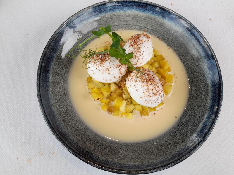 Le velouté de vert de poireau, oeuf frit et tuile de pain est délicieux.