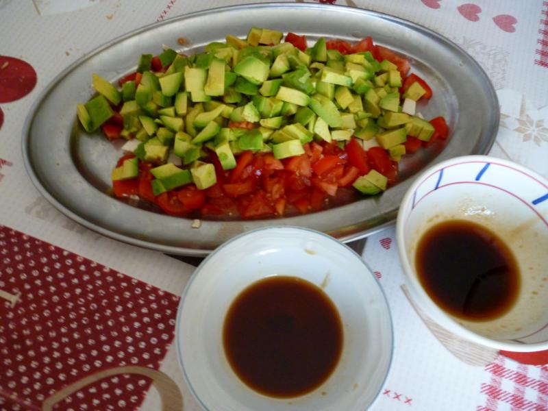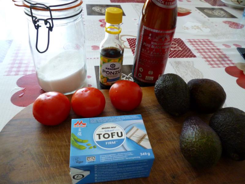 -350g de tofu -3 tomates -3 ou 4 avocats -sauce soja citronnée -huile de sésame -1 càc de sucre en poudre