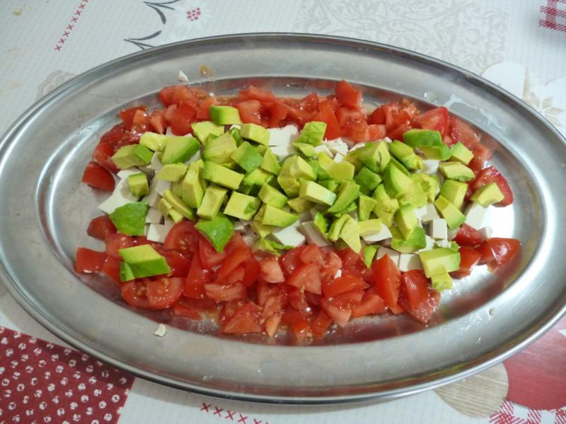 Enfin lavez, pelez et coupez les tomates en dés aussi. Disposez le tout harmonieusement sur le plat de service.