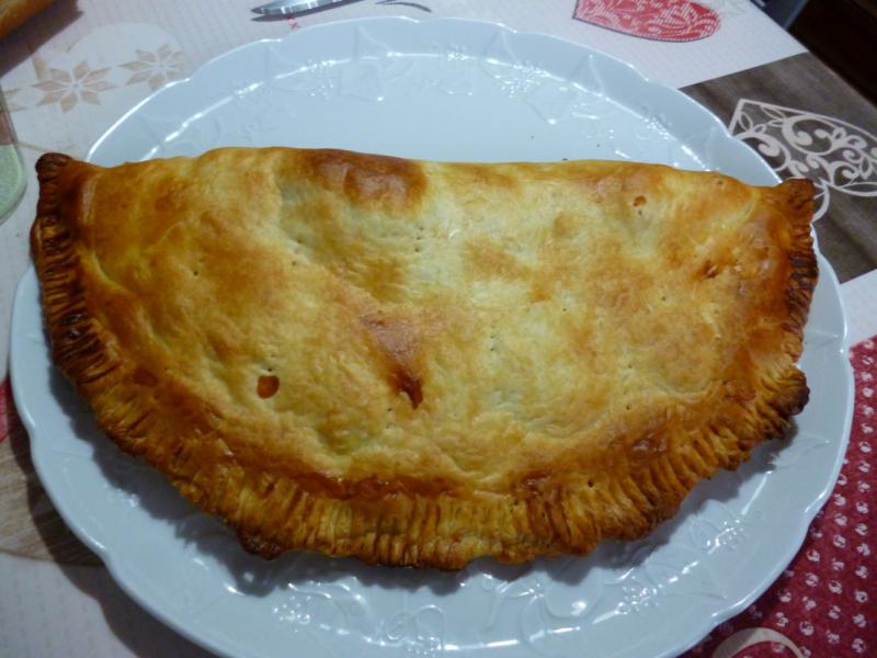 Répartissez cette farce sur la moitié de la pâte étalée en rond.Repliez le chausson et soudez bien au blanc d'oeuf.
