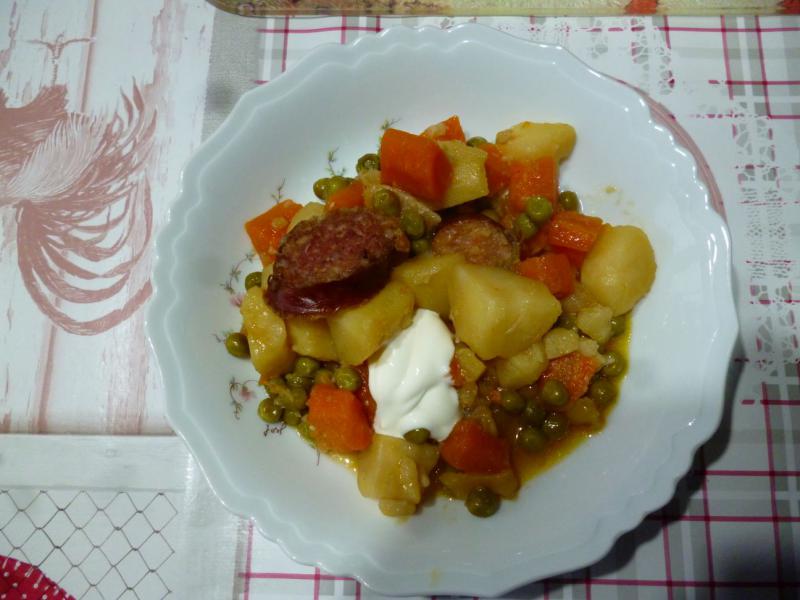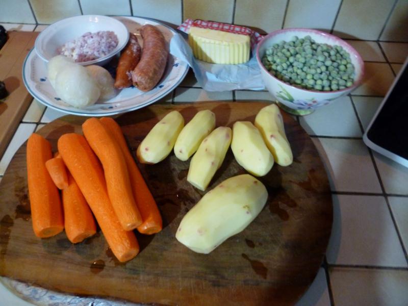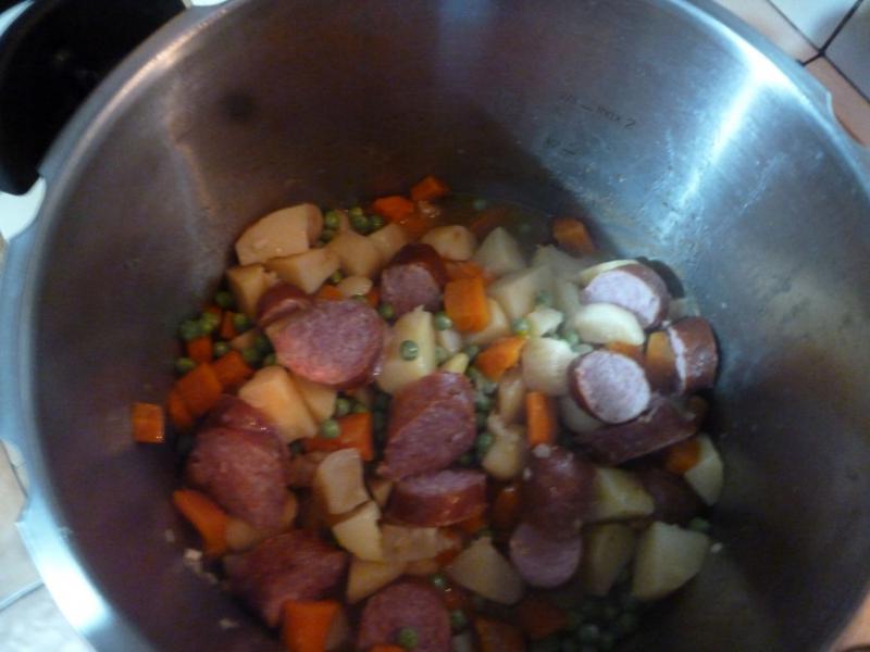 (4 personnes - préparation 10 minutes - cuisson 10 minutes) -250g de carottes -150g de navets -1 bol de petits pois -500g de pommes de terre -des lardons -1 oignon -2 gousses d'ail -beurre et huile - bouquet garni -4 épices -1càc de fond de volaille(facultatif) -50cl d'eau -2 saucisses à cuire Pelez, lavez et coupez les légumes en morceaux.