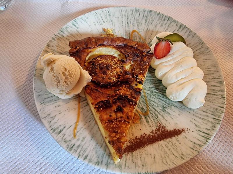 Moi, je finis mon repas par une tarte aux pommes, brisures de spéculoos et boule de glace.