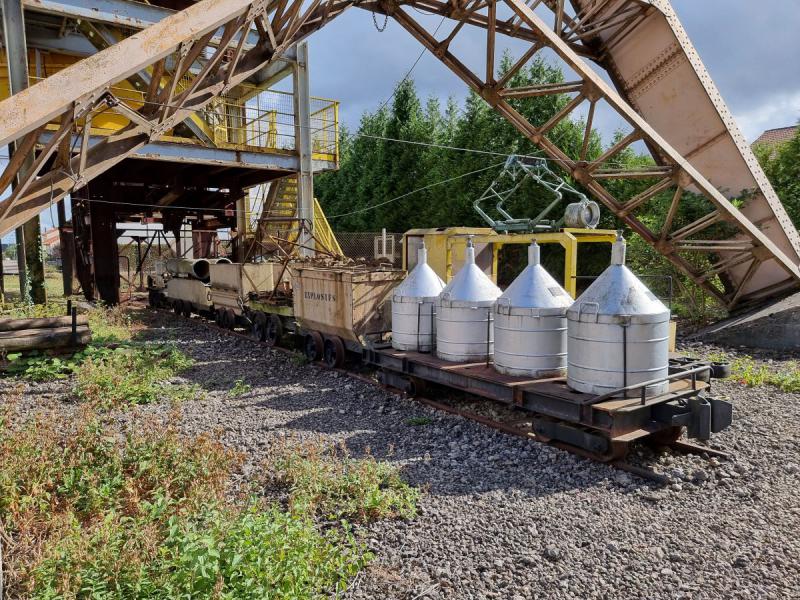 Au pied de chevalement, une rame de wagons en attente de manoeuvres vers le fond de la mine.