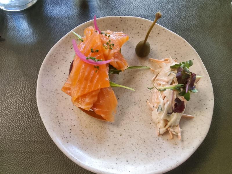 .....ou bagel toasté de saumon fumé maison, crème cheese acidulée, câpres, pickles oignon rouge et aneth.
