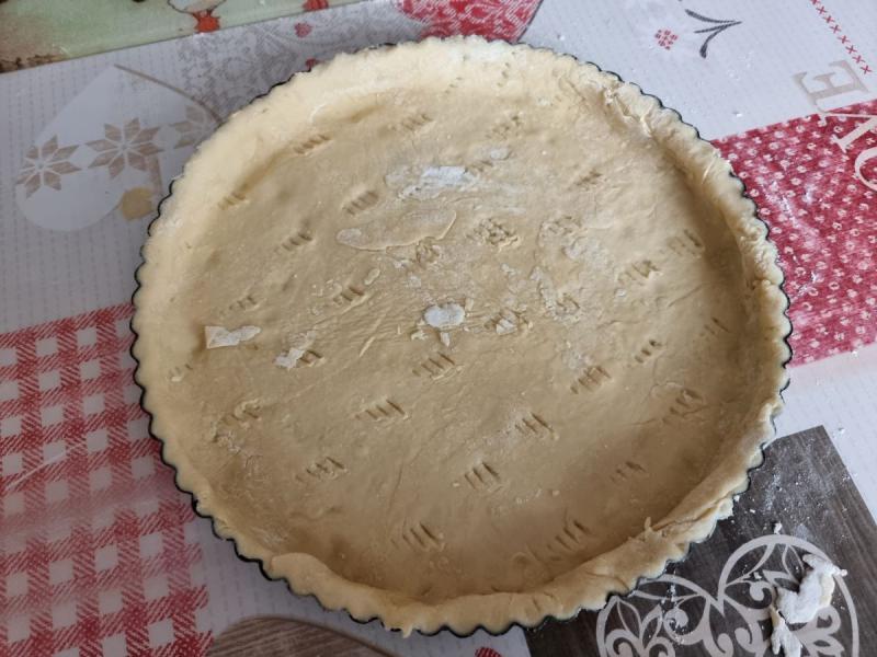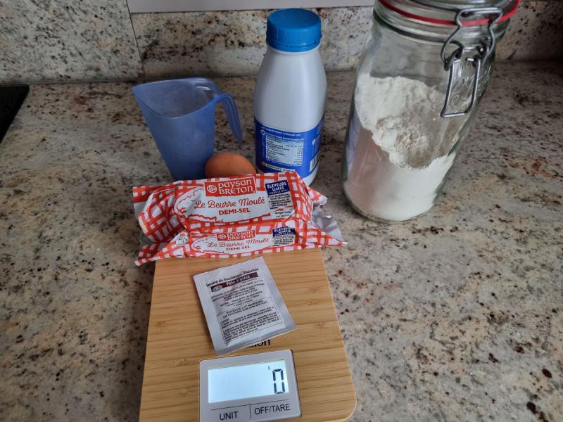 -250g de farine -10g de levure ou un petit sachet de levure boulangère -1 oeuf -10cl de lait -50g de beurre salé Faites tiédir le lait et y faire fondre la levure et le beurre. Au robot, incorporez le lait ainsi obtenu à la farine et à l'oeuf. Faites une boule et laisser reposer le temps de préparer le flan.