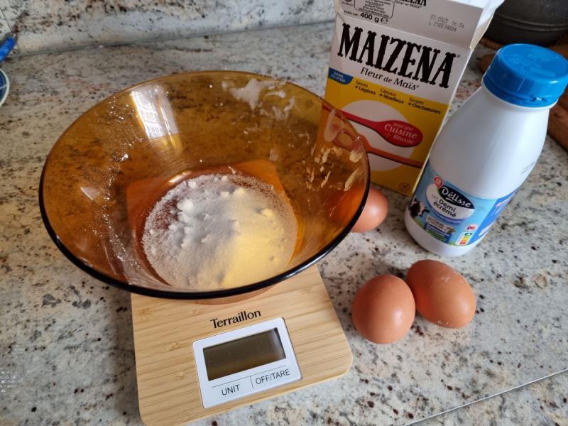 -50cl de lait -3 oeufs -50g de sucre -un sachet de sucre vanillé -1 càs de maïzena Mélangez les ingrédients au fouet.
