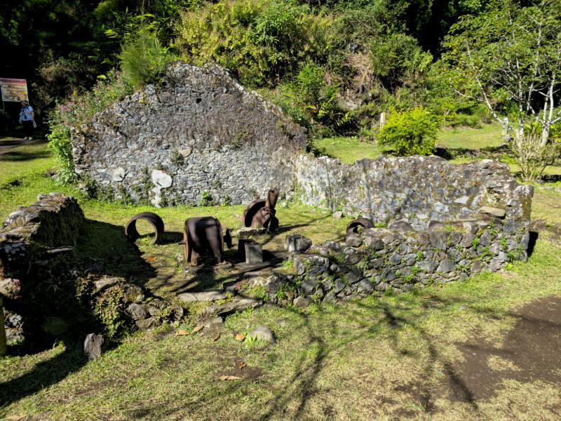 | Parmi les richesses de Salazie, se trouvent les Anciens Thermes d’Hell-Bourg. Avec un peu d’imagination, on peut reconstituer l’établissement avec les salles, la piscine, imaginer les curistes déambuler dans un espace magnifique et totalement dépaysant. Vous pouvez voir ou revoir toutes les balades réunionnaises sur ce lien ! (5 clichés)   Les anciens Thermes de Salazie font partie des incontournables de la région. Plus encore, c’est grâce à eux que Hell-Bourg s’est développé.   En effet, sans la découverte des sources, et l’établissement thermal et l’hôpital qui ont suivi, le village serait resté anonyme et n’aurait jamais eu le niveau d’équipement qui est le sien actuellement.   Découvertes dans les années 1830 par 3 chasseurs de cabris marrons, elles ont structuré le village au fur et à mesure de son développement.   Ce n’est que suite à un éboulis survenu un siècle plus tard, et qui a enseveli les sources, que l’activité thermale s’est arrêtée. Il reste des vestiges de l’établissement, que l’on peut visiter.
