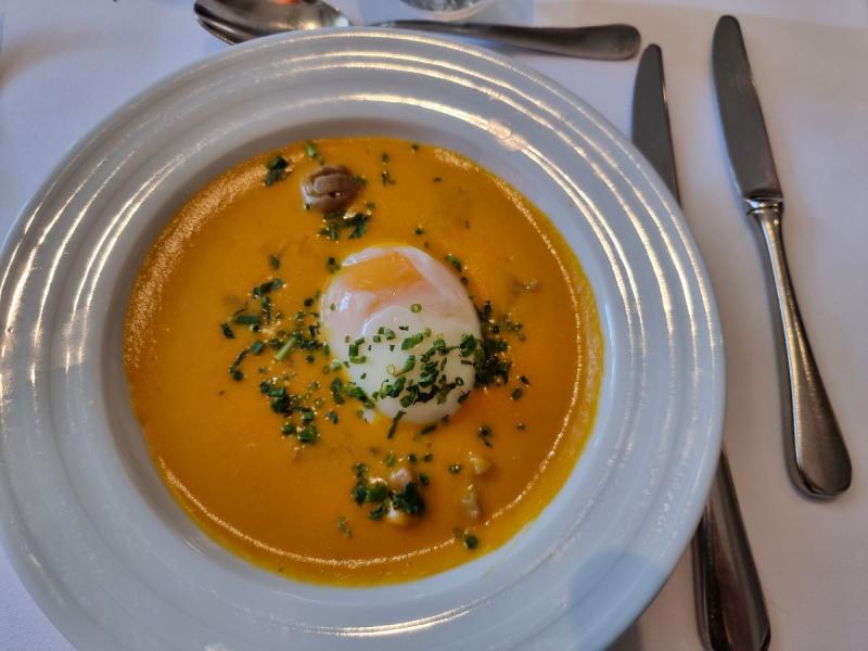 Terminons les entrées par l'oeuf parfait servi avec un velouté de potimarron aux châtaignes. Je dois vous dire que Nicolas s'est régalé !