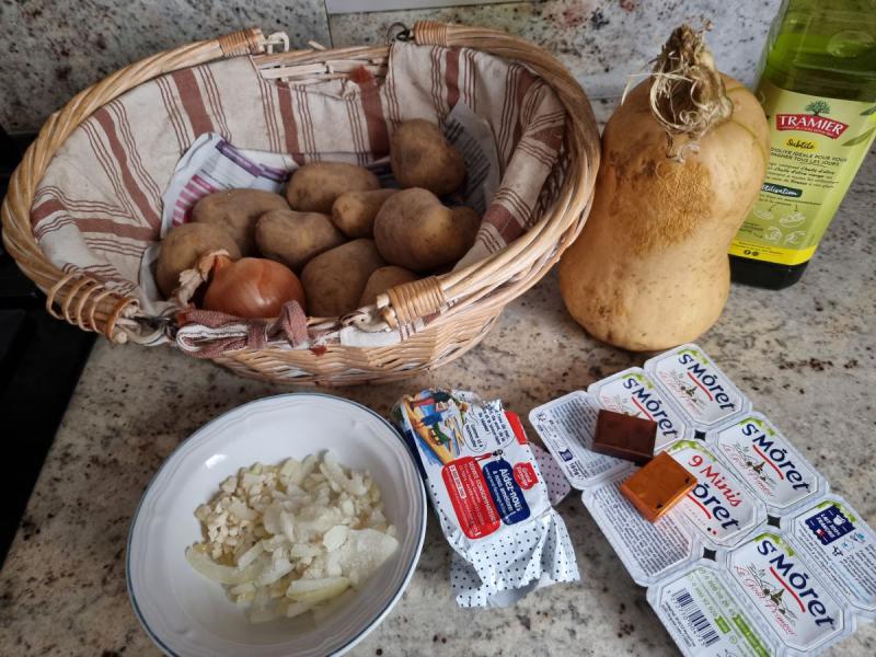(4 prsonnes - préparation 15 minutes - cuisson 20 mnute à la cocotte minute) -1 courge butternut (1kg de chair) -500g de pommes de terre -150g de St Môret -2 tablettes de bouillon -oignons, ail -huile d'olive -beurre