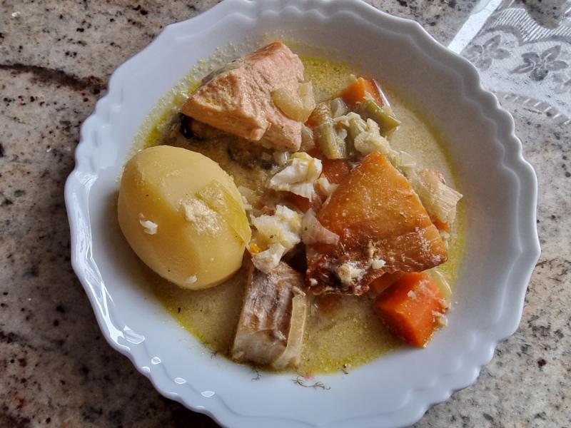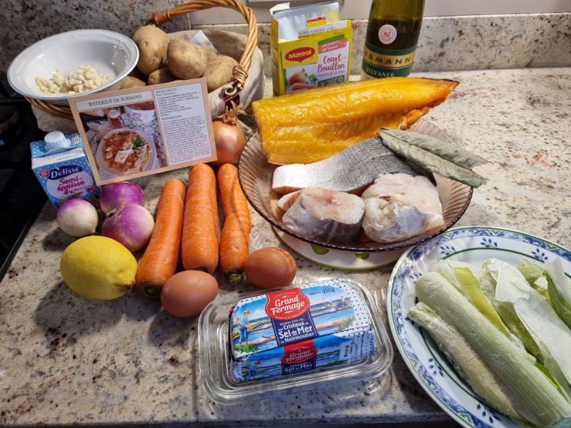 (6 personnes- préparation 20 minutes- cuisson 30 minutes) -1,5kg de poissons (darnes de cabillaud, saumon, 1 filet de haddock fumé) -3 poireaux -3 carottes -1 oignon -1 gousse d'ail -bouquet garni -1l de fumet de poisson -10cl de vin blanc -1 citron -80g de beurre -150g de crème fraîche -sel, poivre