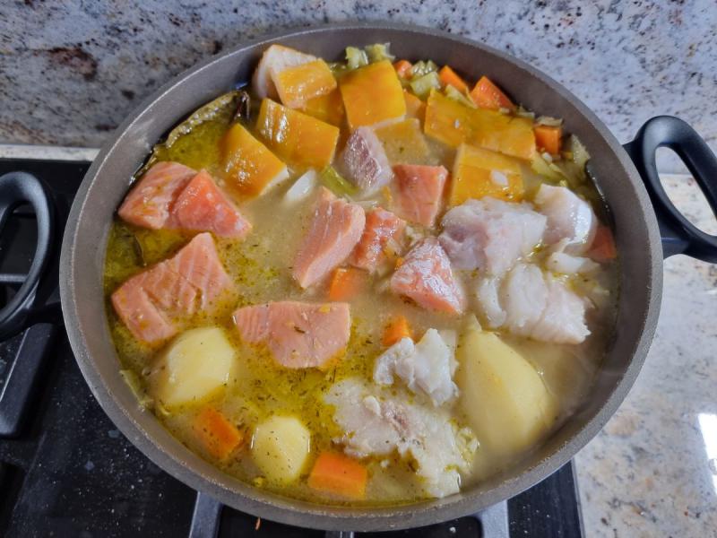 Ajoutez le bouquet garni. Salez, poivrez. Couvrez et laissez frémir 15 minutes. Posez les morceaux de poissons sur les légumes. Salez et poivrez. Laissez frémir 15 minutes.