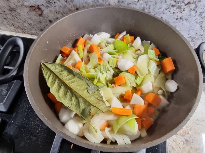 Lavez et nettoyez les légumes. Émincez les poireaux et l'oignon. Coupez les carottes en bâtonnets. Faites revenir les légumes dans le beurre. Ajoutez le vin blanc. Laissez réduire.