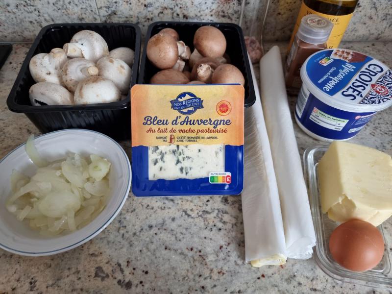 (6 personnes - préparation 40 minutes - cuisson 1h10) -500g de gros champignons bruns de Paris -500g de gros champignons blancs de Paris -1 oignon -10cl de vin blanc -100 g de crème -2 disques de pâte feuilletée -50 g de beurre -200 g de Bleu d'Auvergne -1 œuf -sel, 4 épices