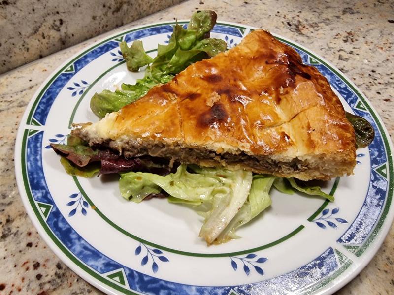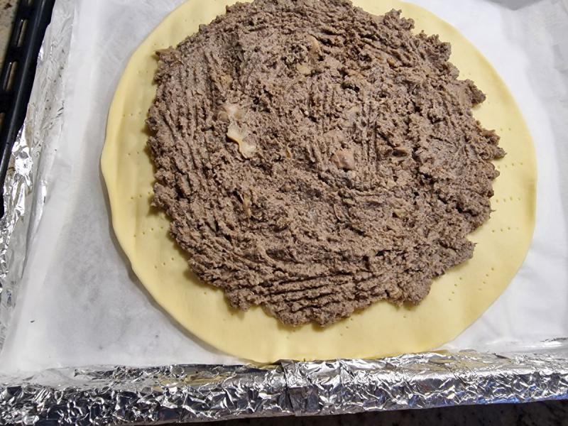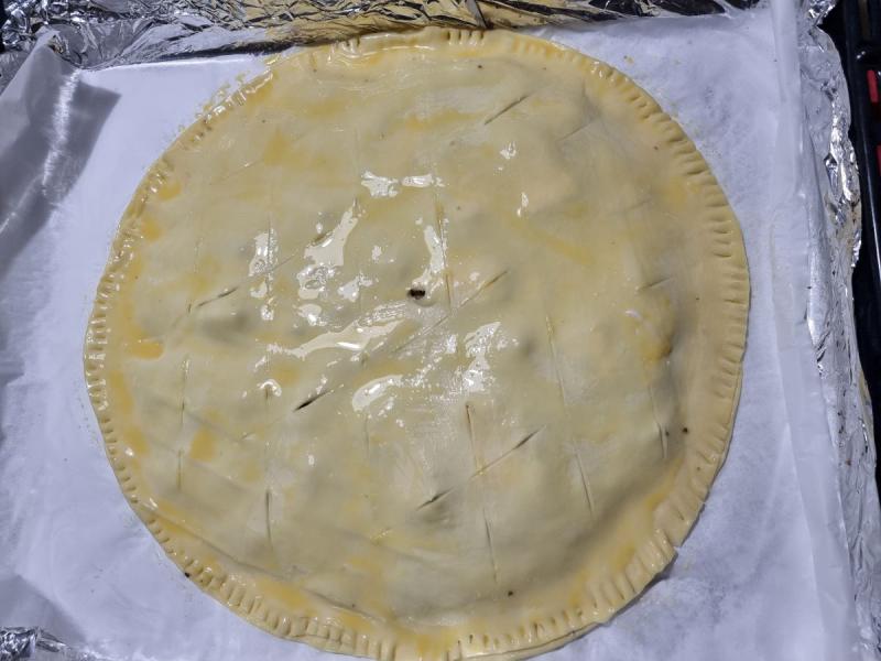 Étalez la duxelle de champignons en laissant 2cm de bord, enfoncez des morceaux de fromage dans la farce. Humidifiez les bords avec un peu d’eau et recouvrez du deuxième disque de pâte. Soudez les bords, marquez-les avec une fourchette. Dorez à l’œuf battu et enfourner pour 45 min.