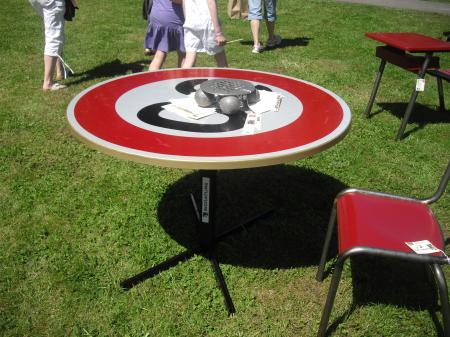 De vieux panneaux de signalisation se sont transformés en table de sallon.