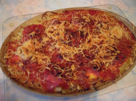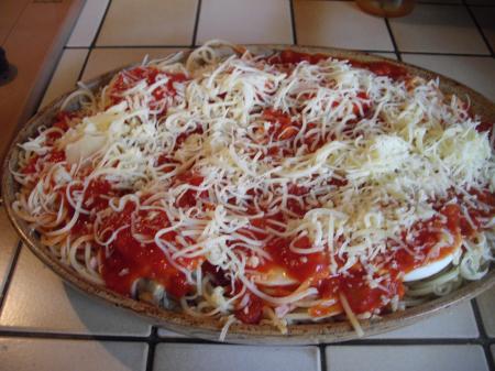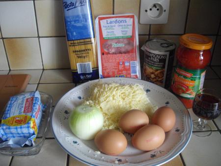 Dans un palt allant au four, mélanger les spaghettis avec un peu de beurre, les lardons, l'oignon, les champignons et un peu de gruyère rapé.