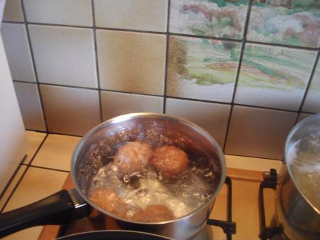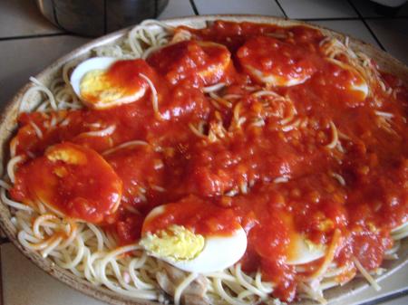 Disposer les oeufs coupés en deux sur les spaghettis.