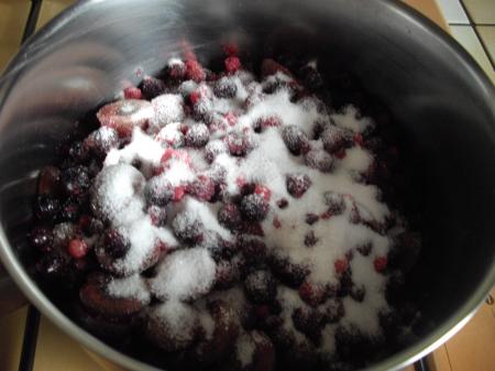 Un mélange de fruits, un peu de sucre et le tour est joué. Dans une casserole je mets à cuire les fruits avec du sucre.