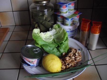La chair de saumon permet de lutter contre l'excès de cholestérol. Le saumon se consomme frais, congelé, fumé ou sous vide. Les ingrédients: -1 boîte de saumon -2 citrons -6 petits suisses -2 càs de crème fraîche -2 gros cornichons -ciboulette, paprika, poivre, sel -des feuilles de salade -noix Hacher les cerneaux de noix.