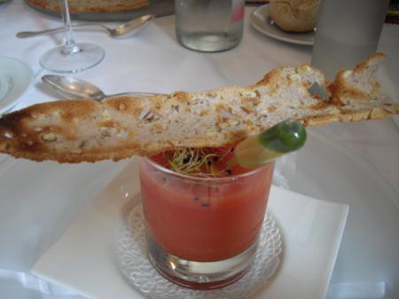 Mise en bouche constituée d'un gaspacho de tomates avec sa pipette de citron vert.