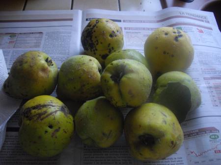 Le coing est le fruit du cognassier. piriforme et volumineux il est cotonneux en surface et, à maturité, est jaune et très odorant. Tout comme les nèfles, les coings crus ne se consomment qu'après blettissement.