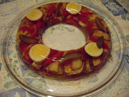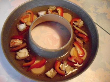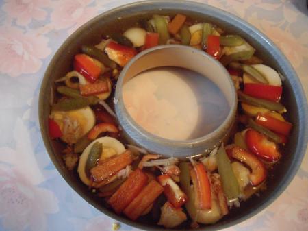 Coupez les cornichons en lamelles. Lavez-le poivron, épépinez-le et coupez-le, lui aussi, en lamelles. Prenez un moule en couronne et versez-y une couche de gelée d'un centimètre et laissez prendre 15 minutes environ au réfrigérateur.