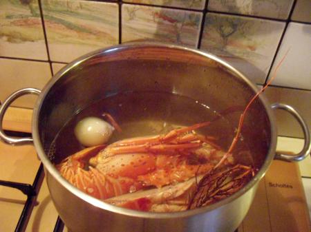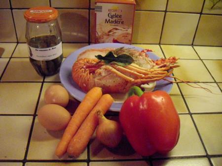 Le sens culinaire, apparu au XVIIIe siècle, serait né de la comparaison de la gelée avec le serpent en terme de couleurs, d’aspect et de contact froid. De plus, certains moules ont une forme de serpent lové. Aujourd'hui, je cuisine l'aspic de langouste. Les ingrédients pour cette recette: Préparez le court-bouillon.