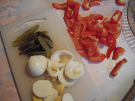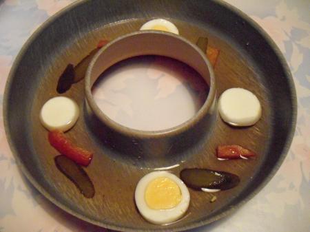À ce moment, disposez harmonieusement des rondelles d'oeufs durs, des lamelles de cornichons et les lamelles de poivrons sur la première couche de gelée. Versez, à nouveau une couche de gelée et laissez prendre au réfrigérateur 1/4h environ. Au bout de ce temps, la deuxième couche est prise.