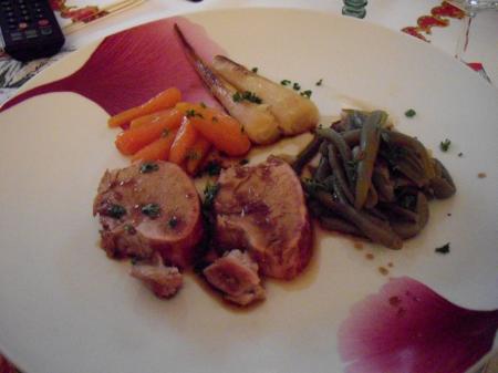 Pour le plat, Gaby nous a proposé du filet mignon de porc au sirop d'érable et sa garniture de légumes: carottes glacées, panais au beurre et haricots verts aux lardons.