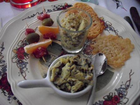 L'apéritif était constitué d'une brouillade d'oeufs de cailles à la truffe, d'une verrine de coeur d'artichaut à l'ail, de deux brochettes surprises et de chips de parmesan.